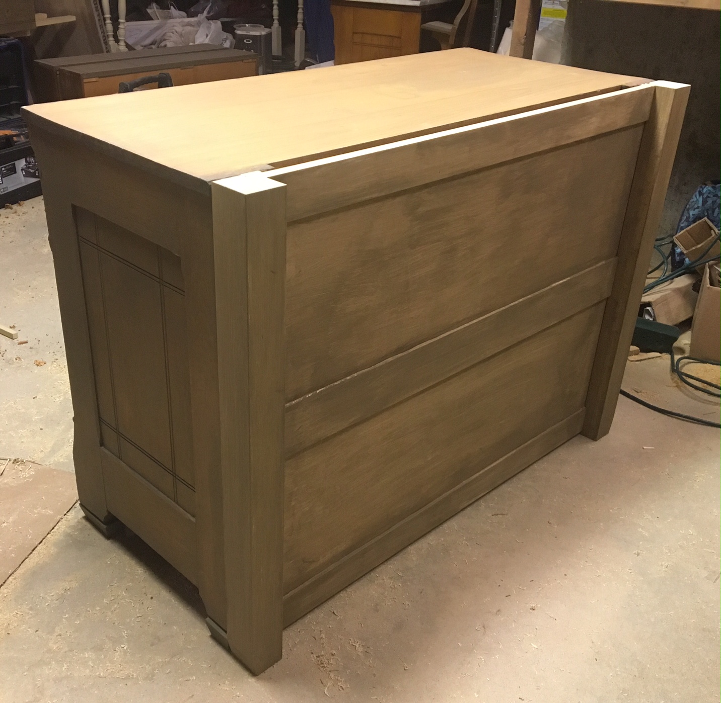 I tapered the bottom of the posts to compliment the feet I installed on the original dresser legs. I also made sure that the posts were slightly offset to the cabinet on the sides to create some design interest rather than attaching them on the same plane which would have looked makeshift to me. Using glue and wood screws secured from the inside of the dresser, I attached the panel backing. Here's a photo showing the panel attached to the dresser after I applied the coat of stain. You can see how the poplar wood took the first coat of stain as compared to the side face of the alder wood dresser. With some light sanding to both woods and carefully applying a second thin coat of stain, I achieved a more uniform look on the wood surfaces.
