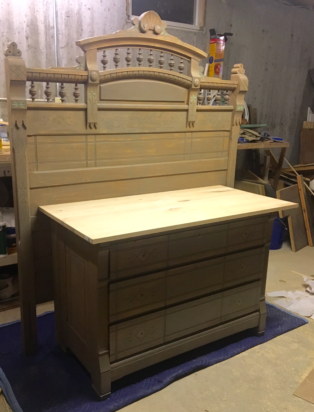 The photo to the left shows the dresser after I stripped it - the headboard is shown before stripping.