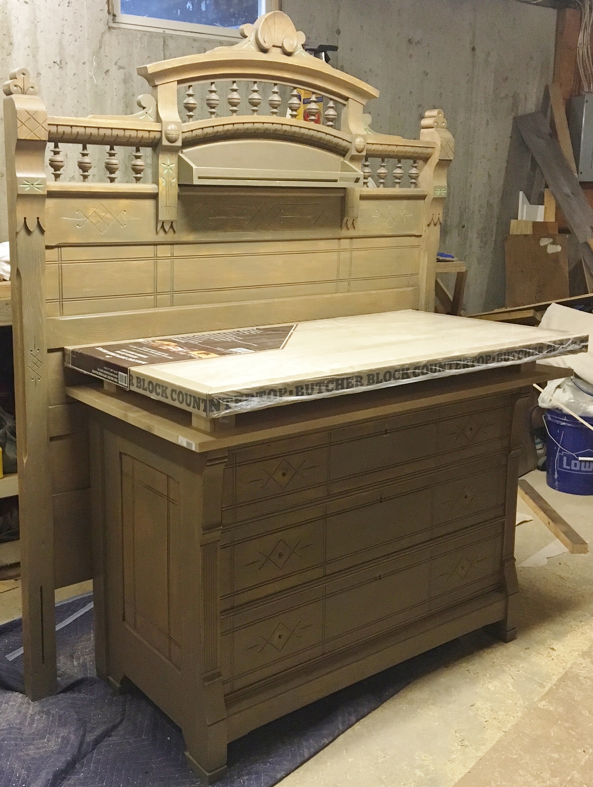 With the removal of the rollers and the added weight of the back panel and the oak and birch counters, this piece is very stable in place and is heavy enough to support the headboard behind it against a wall WITHOUT having to bolt it to the back of the cabinet. That provides maximum flexibility in using the headboard for this application and for potential use as part of the bed when I refinish the other pieces.